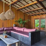 A refrigerator, an oven, and glassware are standard in an equipped kitchenette. The villa invites guests to relax in a private garden fitted with a balcony.